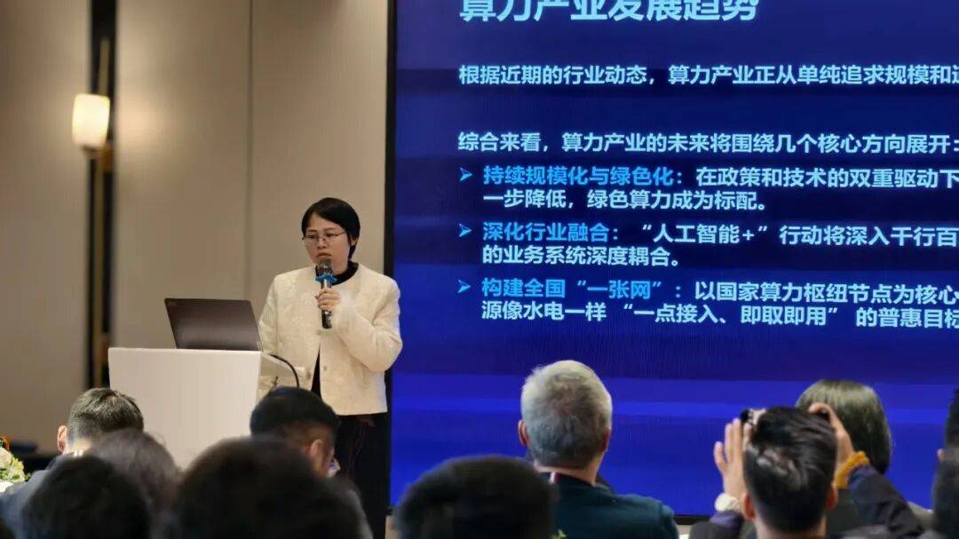 会上,深圳市数字经济产业促进会数字基础设施分会秘书长、绿色网格(TGGC)专家工作组副组长、DTDATA总经理钟少梅代表组织单位向大家表示欢迎。随后,她深入解读算力产业发展趋势与政策,指出当前算力产业正告别单纯追求规模和速度的阶段,迈向高质量、系统化与协同化发展的新征程。她特别提到,在绿色化发展方面,PUE作为衡量数据中心能效的关键指标,降低PUE已成为行业共识;而液冷技术凭借其高效散热、节能降耗等优势,逐渐成为行业绿色化转型的关键技术之一。未来,算力产业将聚焦持续规模化与绿色化、深化行业融合、构建全国“一张网”等核心方向。